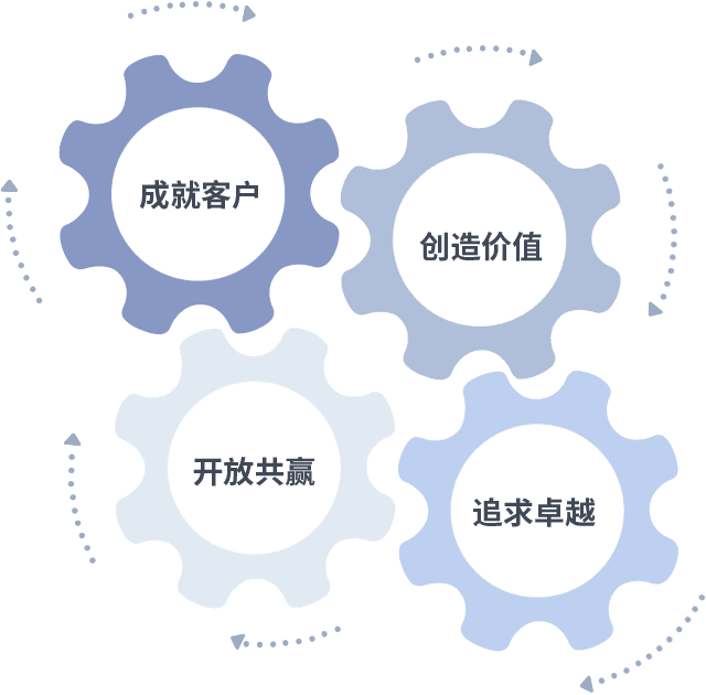 成就客户是一切决策的出发点,,,创造价值是衡量所有工作的标准,,,追求卓越是我们做事做人的态度,,,,开放共赢是我们的格局也是最终的结果。。。。价值观的齿轮环环相扣,,推动着组织里的每个人不断向前。。